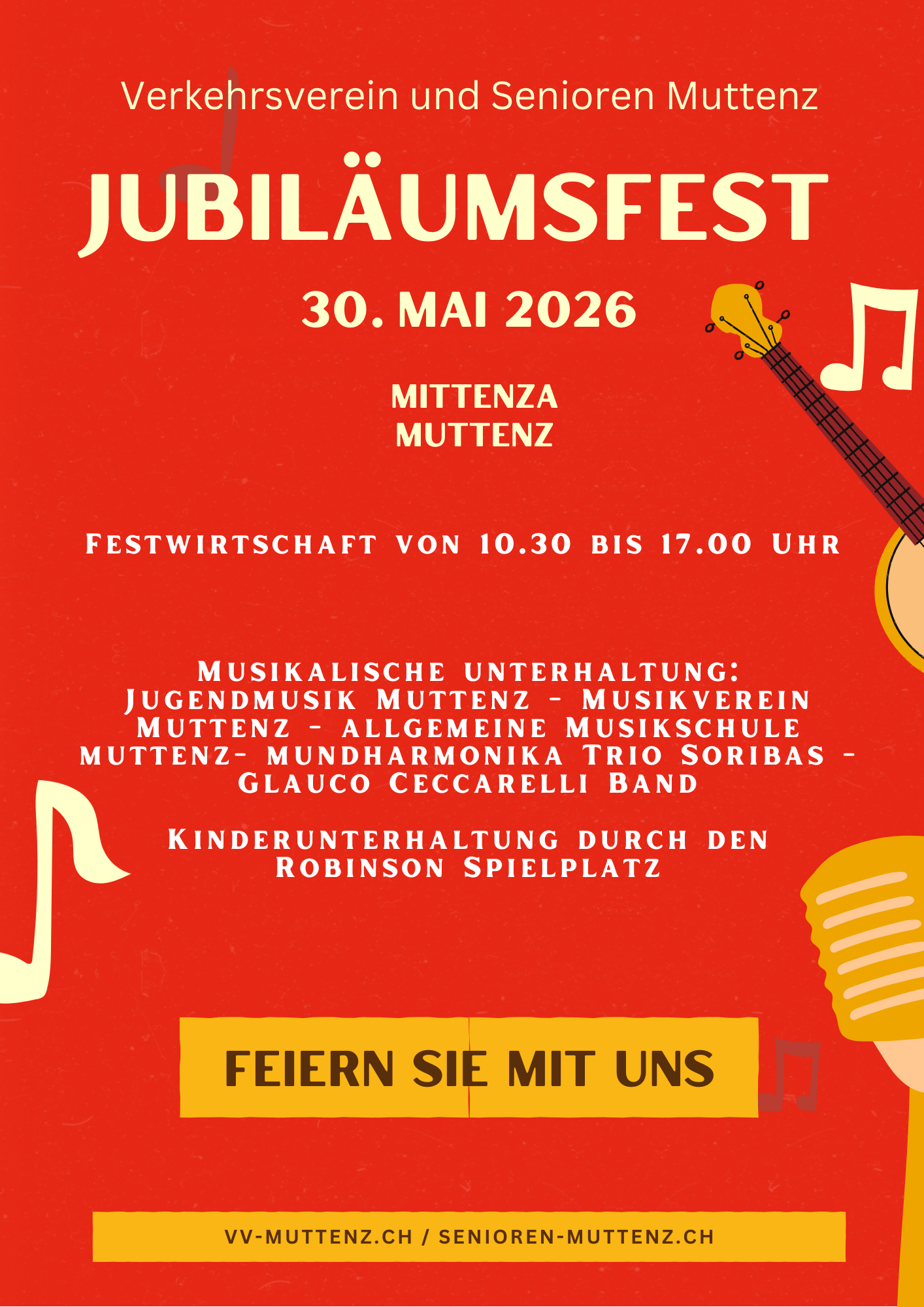 Am Samstag, 30. Mai 2026, feiern die Senioren Muttenz und der Verkehrsverein Muttenz gemeinsam ihre Jubiläen. Zu diesem besonderen Anlass laden wir unsere Mitglieder sowie die gesamte Bevölkerung herzlich ein.